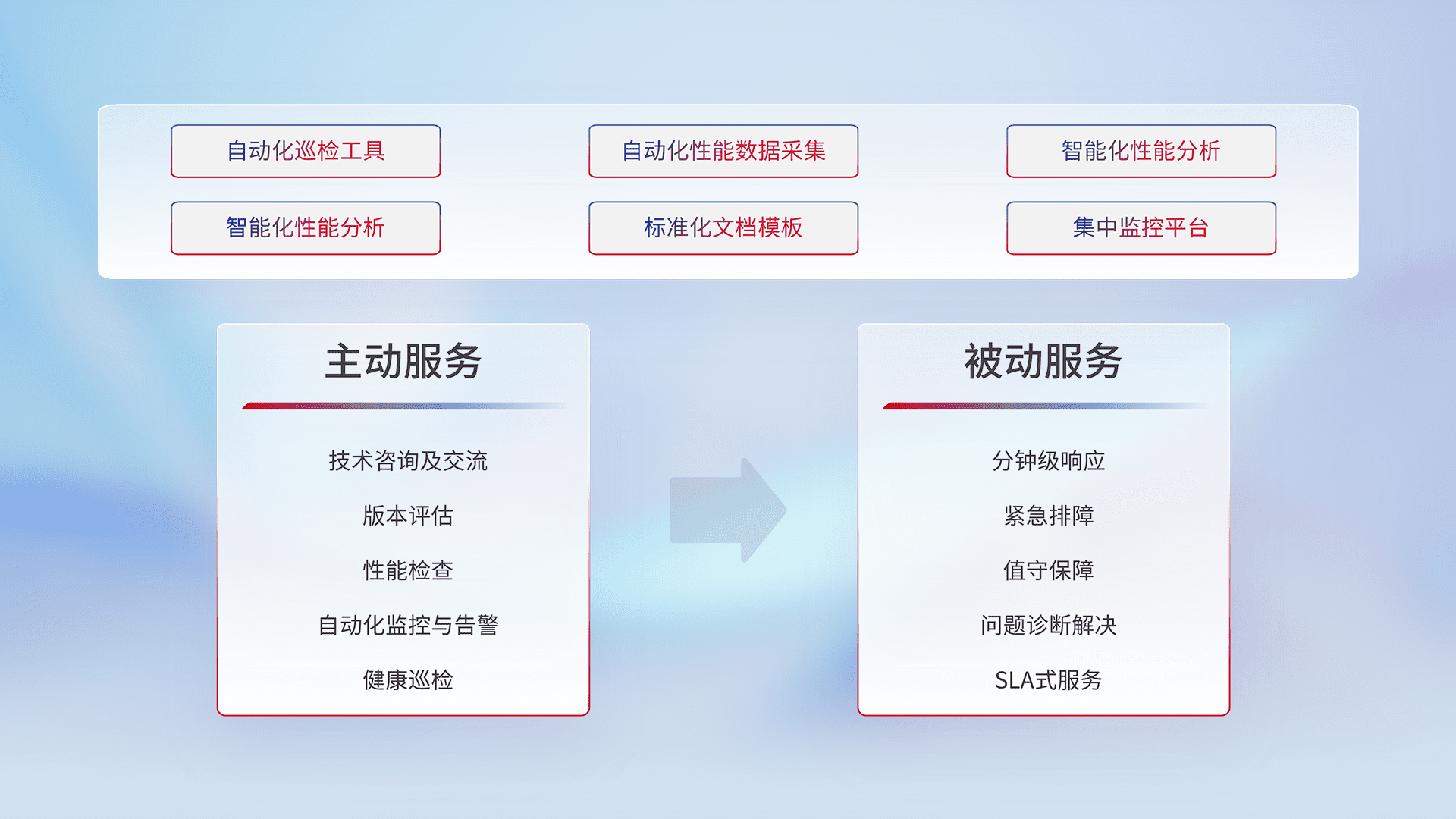 智能化工具和标准化文档,,,,保障服务质量,,提供主动服务(包含技术咨询、、、、版本评估、、、、性能检查、、自动化监控与告警、、、、健康巡检)和被动服务包含(分钟级响应、、、紧急排障、、、、值守保障、、问题诊断解决、、、、SLA服务)。。。。